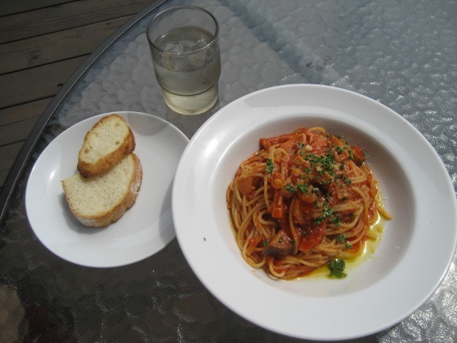 小エビとキノコのトマトクリームパスタ